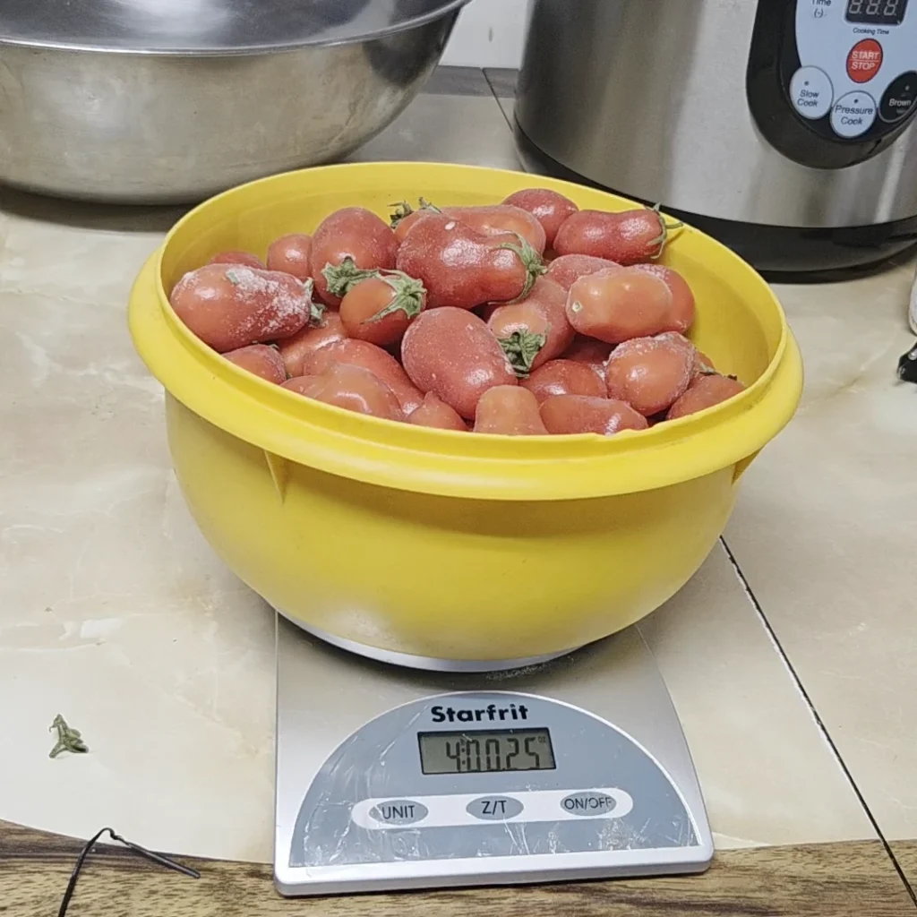 In this case, I started with frozen Roma tomatoes. My original plan was diced tomatoes, but once they were thawed, that idea went out the window. Frozen tomatoes don’t dice cleanly, and forcing it just turns into a mushy mess. Since the texture was already breaking down, crushed tomatoes made far more sense.