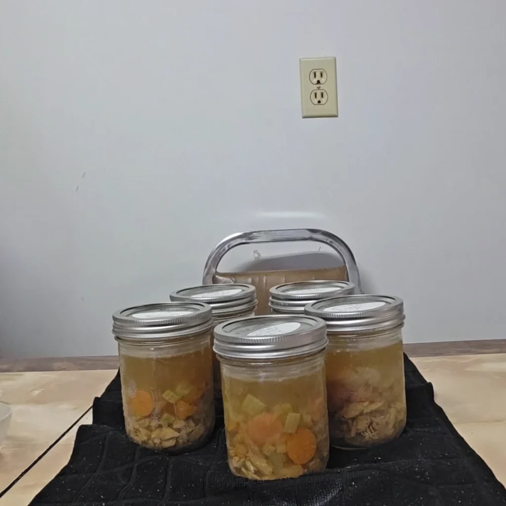 In the end, I had five pints of thick, hearty chicken soup and a few cups left over for a fresh bowl. I also canned four pints of stock separately so I’d have homemade stock on hand for the next batch. The soup came out rich and full of flavor. Next time, I might fill the jars only a quarter or a third with solids so there’s more room for broth or noodles when reheating, but as it is, it’s perfect — thick, comforting, and exactly what homemade chicken soup should taste like.
